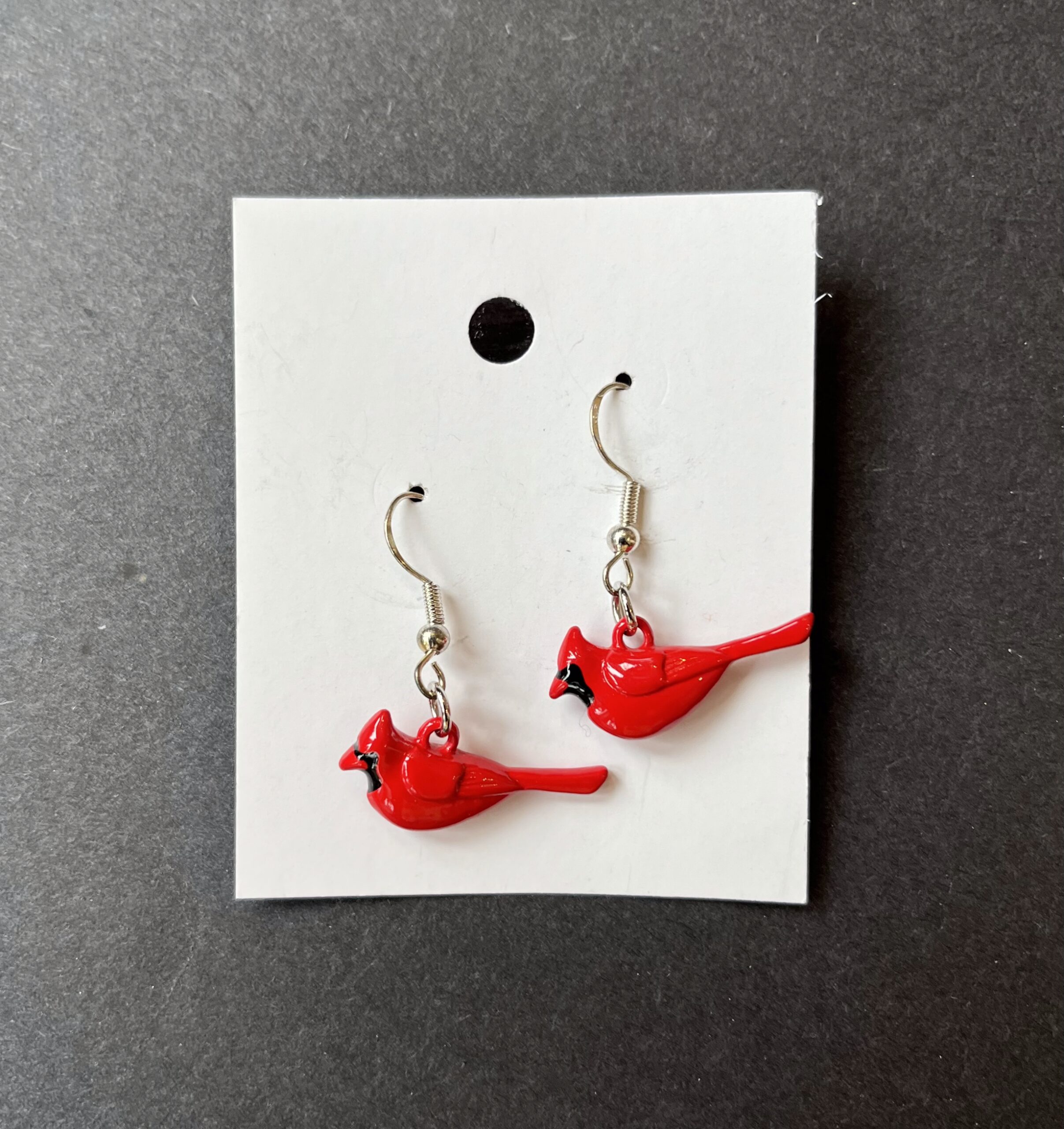 What fun! Cardinal earrings made by MAC. Earrings measure just under 1 inch from tip of beak to tail. Seeing a Cardinal is thought by many to be a happy, uplifting sign.