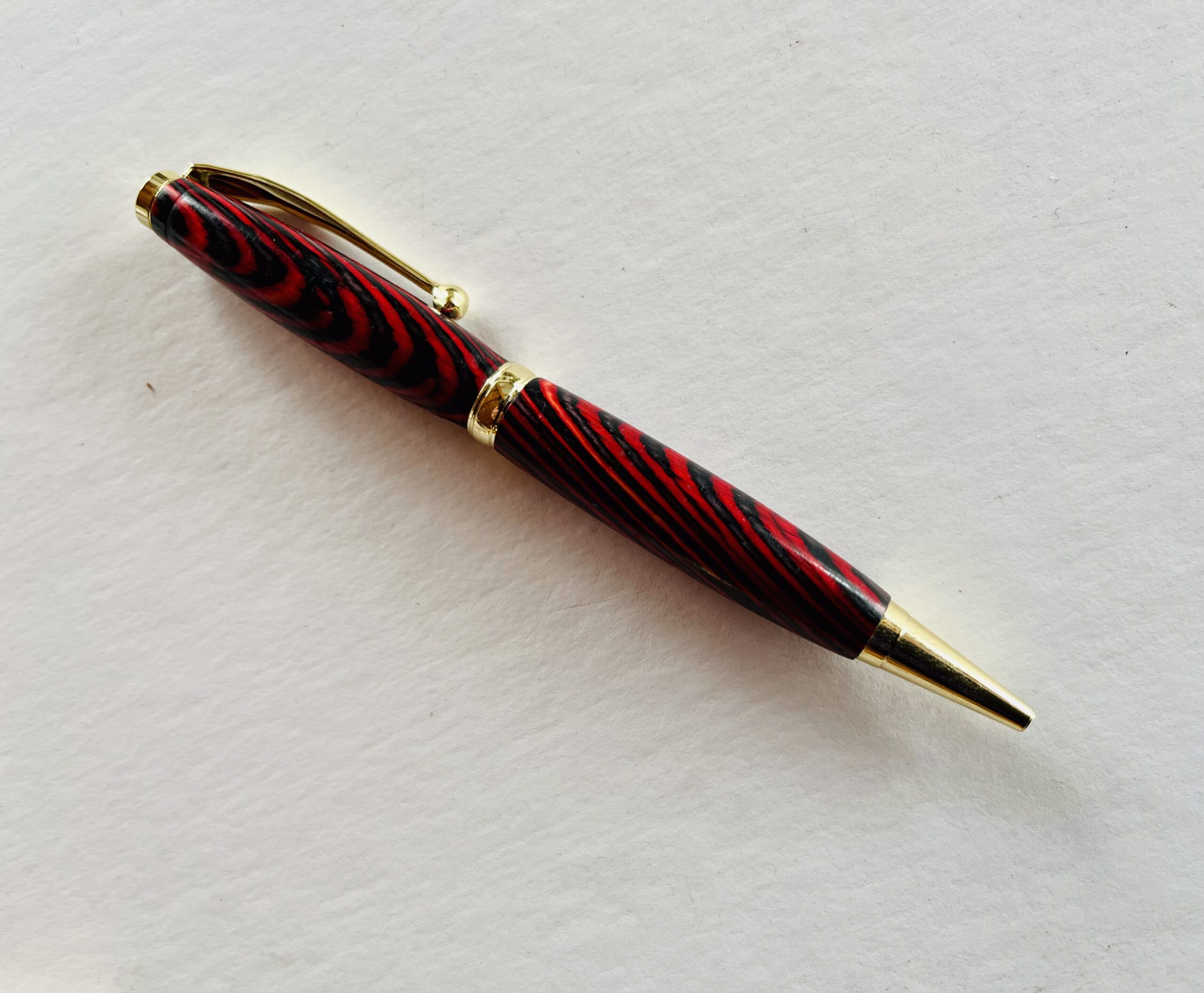 Stripes of red twirl around this unique wooden pen handturned by Sam and Weeza Sanderson of Sanderson’s Wooden Bowls. A beautiful and practical gift to inspire the pleasure of writing. Pen measures just over 5 inches long and feels wonderful in your hand.