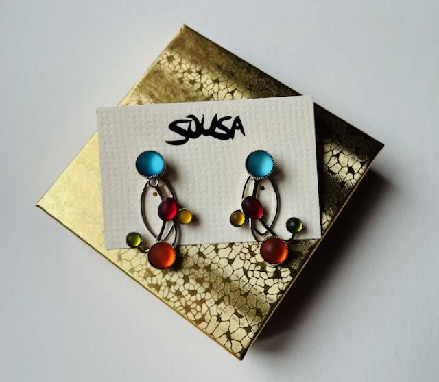 Colorful stones are set in plated brass setting and are riveted to a surgical steel post mounted on a nickel free rhodium brass base. These earrings are 1.5 inches long. Stop in to see the ever-changing collection of Carole’s earrings and necklaces.