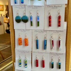 Catch the light with these vibrant orange and red glass earrings by Cherie Marshall. Length about 1.2 inches. Other mixes of color available. Stop in or call for current choices.