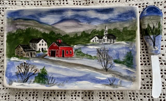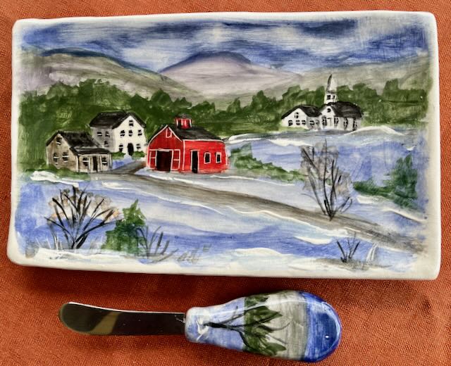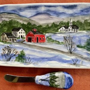 Handmade and hand painted original design by Roseanne Henning. this lovely and practical pottery serving dish is just right for cheeses and other snacks. Plate measures 9.5 by 6 inches and comes with a matching knife.