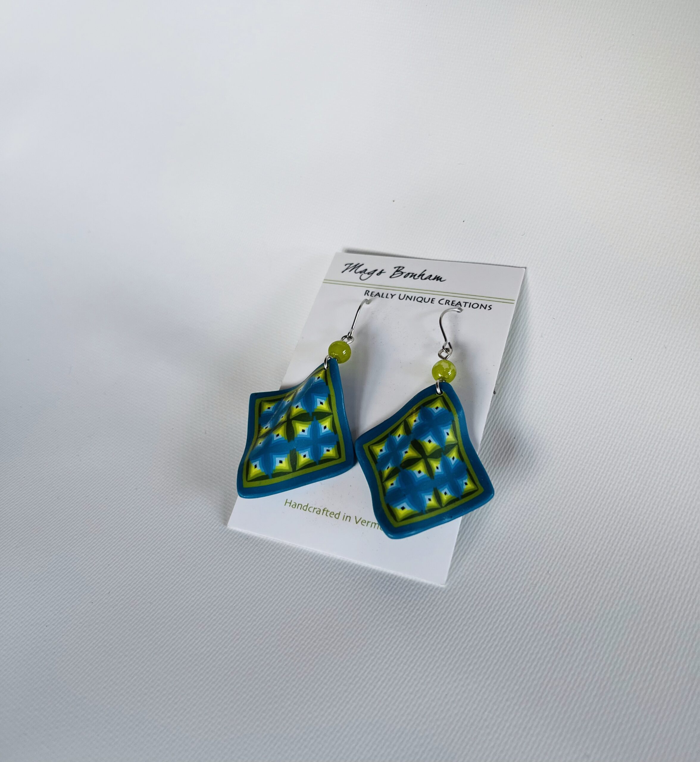 Made from polymer clay, these blue and green quilt pattern earrings are not painted but created from pigmented clay by Mags Bonham. Lightweight with a graceful twist, they measure just over one square inch.
