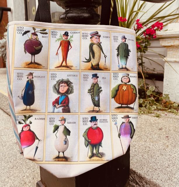 Sturdy and practical tote bag is adorned with vegetable Seed Packet Designs, each with a unique personality. It measures approx. 13 in. high by 13 in. wide with straps long enough to sling over your shoulder. Designed by artist Tim Campbell, of Keene, N.H. Tim recently passed away but we are happy to have his work continue on at the Vault.