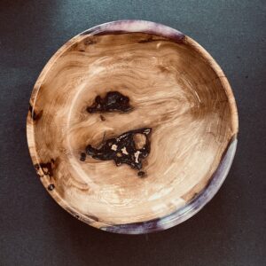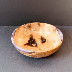 Made by Ross Meyer of Tulip Tree Turnings, this unique bowl of Spalted Beech measures 6.5 inches across. It’s compact size makes it useful  for serving food or holding keepsakes. The purplish resin highlights add to its interest. Surprise someone with this one of a kind gift.